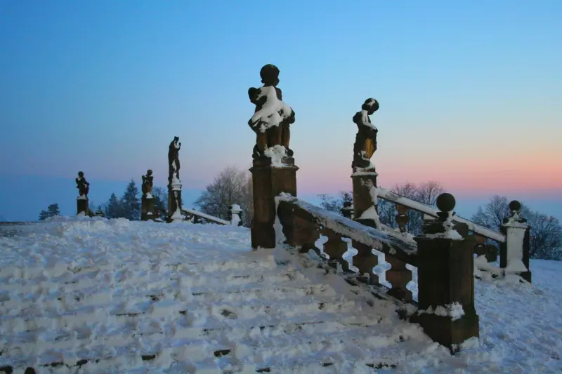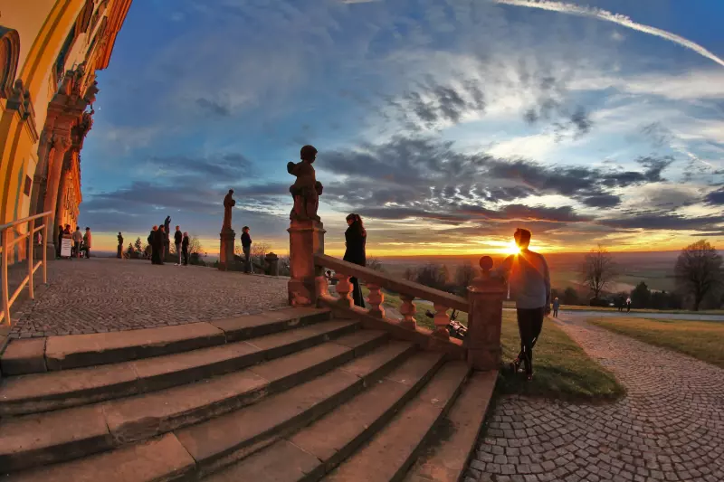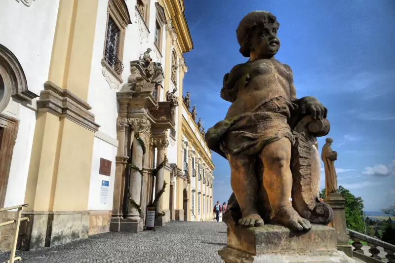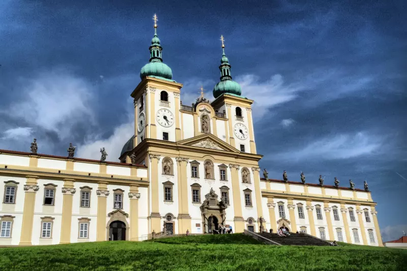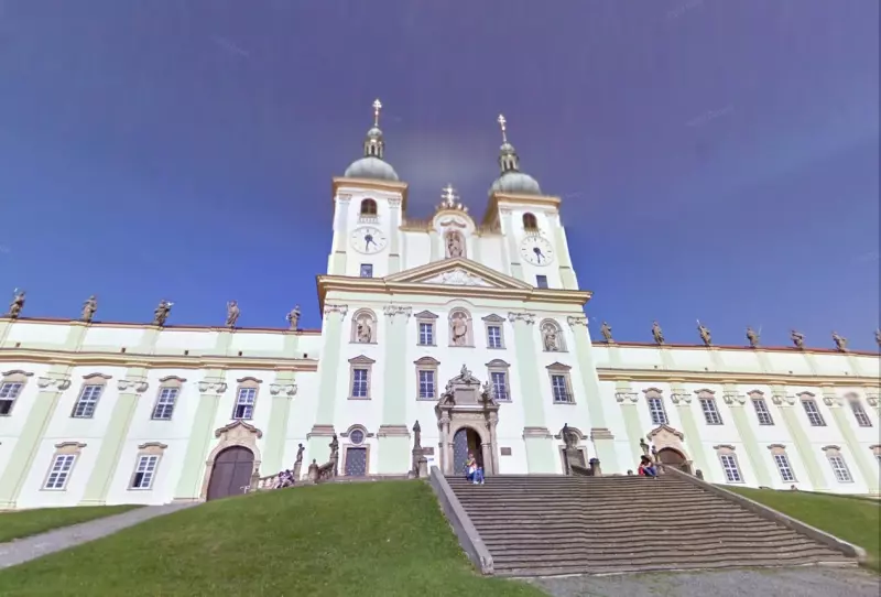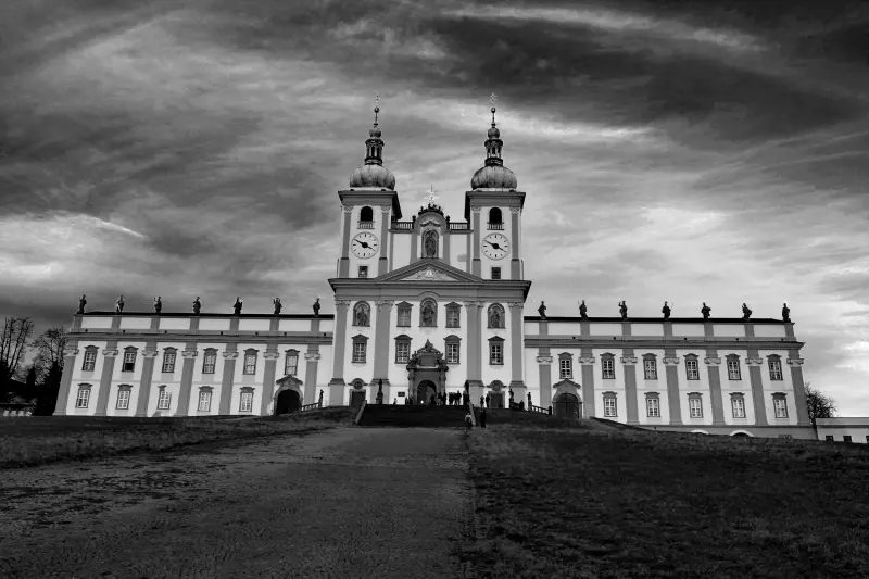 The Baroque pilgrimage church with a two-tower frontage is a distinctive landmark of the landscape around Olomouc. Adjoining the church building, there are side wings with an attic carrying statues of 12 apostles and two saints – Saint Sebastian.and Saint Roch. Behind the church, there are a cloister and the Chapel of the Virgin Mary. The ceiling of the single-naved interior is vaulted over by a massive dome. The nave is flanked by side chapels.