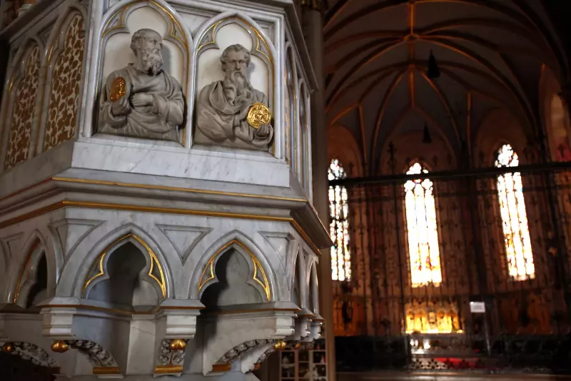 The Gothic pillars of the three-nave hall date from the 13th century. A large presbytery measuring 35 × 23 metres was added as part of an early Baroque reconstruction. At the end of the 19th century, it received, along with the entire interior and exterior, its Neo-Gothic appearance. Beneath the presbytery lies a crypt accessible by two side staircases. On the south side of the church, there is an entrance to the Mannerist St Stanislaus’ Chapel, with tombstones from the 16th and 17th centuries positioned on either side. A shrine containing the relics of St Jan Sarkander, canonized by Pope John Paul II in 1995, is placed at a Neo-Gothic altar beside one of the pillars. The cathedral’s organ is one of the finest instruments of the Romantic period in the Czech Republic.