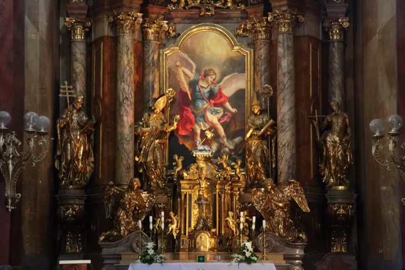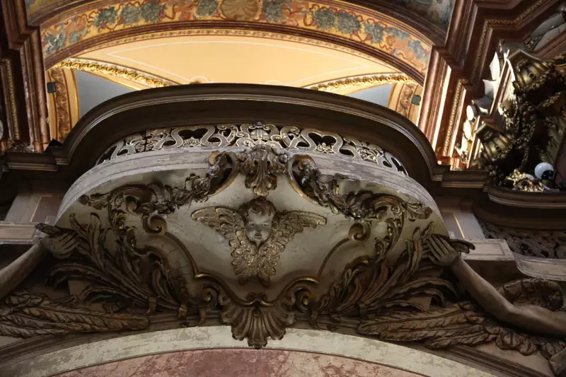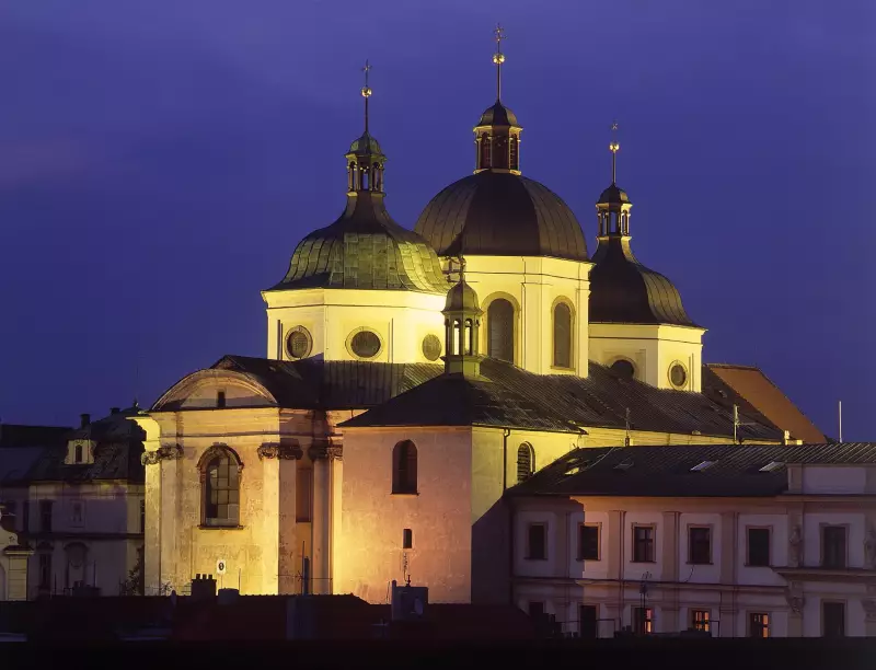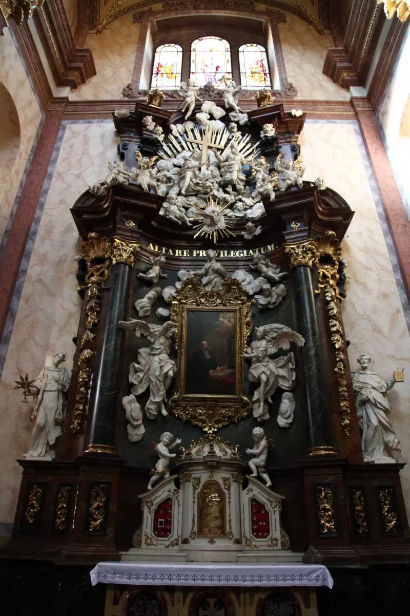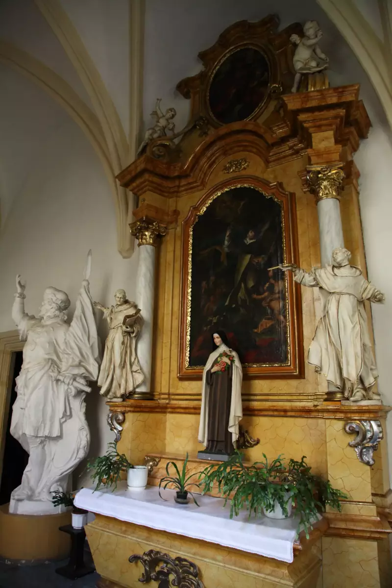 The single-nave structure with side chapels has a rich sculptural and painting decoration and is an example of the Baroque appeal aimed at the senses of the church-goers. The front face of the church is decorated with statues of the Virgin Mary and the Salvator Mundi by Ondřej Zahner and date from the 1830’s. A Gothic St. Alexei Chapel and a Gothic Cloister with cross vaulting adjoin the church building.