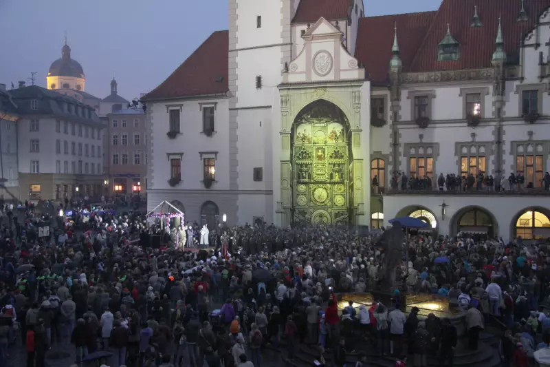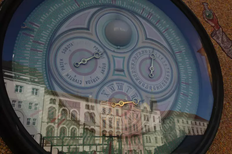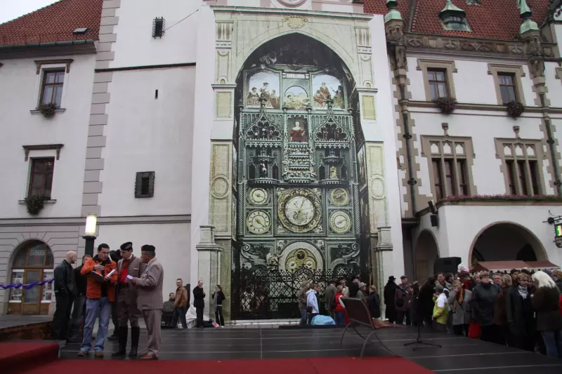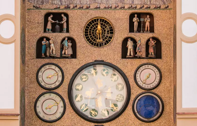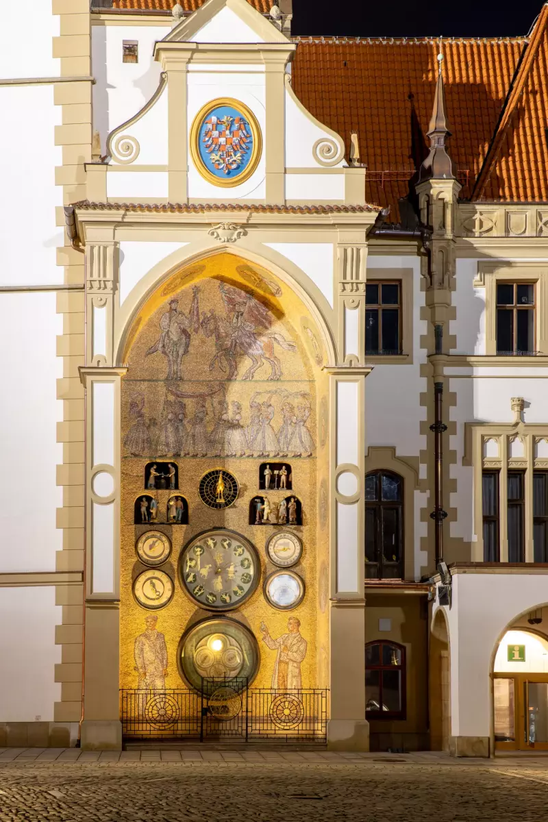 The Olomouc Astronomical Clock is situated in the northern facade of the Town Hall. It is set into a 14 m high pointed-arched recess. The present-day appearance of the Clock dates back to the 50s of the 20th Century and bears the traces of the former official aesthetic of socialist realism. The mosaic decoration of the Clock is made of various portrayals on the lateral sides of the recess depicting characteristic work for each month of the year. The author of the design, Karel Svolinský, introduced the folklore motif of the Ride of the Kings at the top of the recess. Figures representing the different working classes are depicted in the lower part of the mosaic decoration.