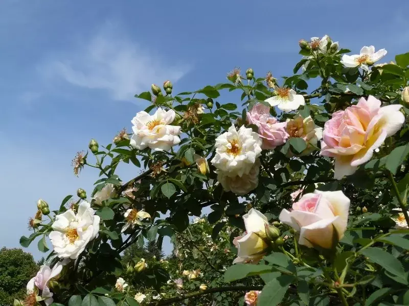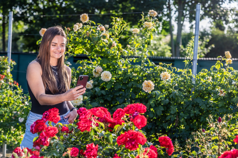 V expozici s 10 000 keři růží je soustředěno více než 670 domácích i světových odrůd. Návštěvník zde objeví nejen sortiment růží velkokvětých, ale i barvami zářící růže sadové, pnoucí, pokryvné a původní botanické druhy. V rozáriu lze obdivovat i málo známý ibišek vodní (Hibiscus moschetos) s červenými, růžovými a bílými květy o průměru až 20 cm a z exotických stromů korkovníky amurské (Phellodendron amurense) a liliovník (Liliodendron tulipifera) s listy připomínajícími svým tvarem tulipány.