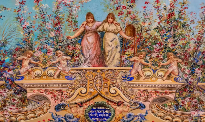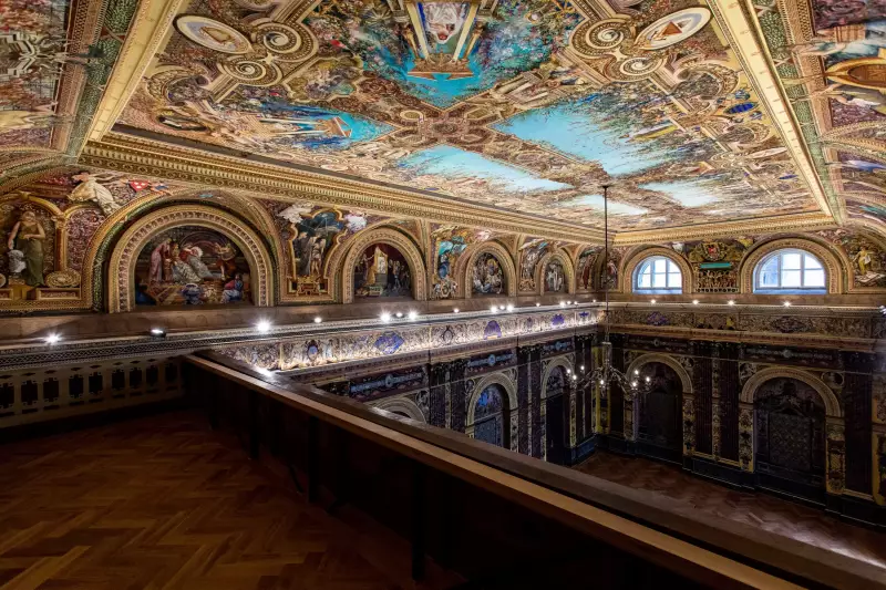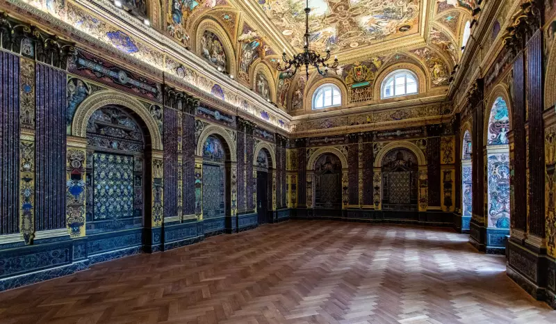 Slavnostní sál v budově, která vznikla v letech 1873 až 1875, je na všech stěnách i na stropě vyzdoben ve stylu neorenesančního dekorativismu s prvky barokního iluzionismu. Diváka při pohledu na výzdobu sálu fascinuje hustota a složitost výjevů i ornamentálních prvků. Malířská výzdoba znázorňuje mnoho alegorických scén, mytologických výjevů, postav, vše je zasazeno do ornamentálních rámů a doplněno dekorativní výzdobou.