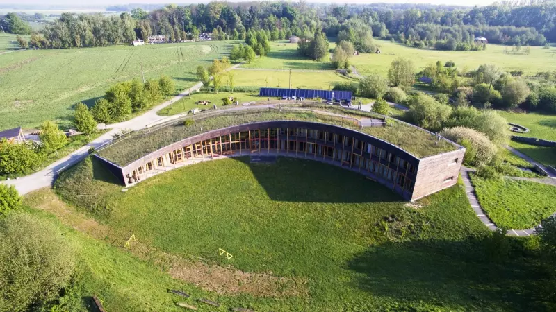 Nízkoenergetický dům byl postaven v roce 2007 na zelené louce. Hned v témže roce získal cenu Grand Prix architektů. Má tvar půlměsíce a je z jedné strany přihrnutý zemním valem tak, aby co nejméně rušil okolní přírodu. Je vystaven ze dřeva, betonu, skla, kamene a nepálených cihel. Stavební řešení domu využívá zejména principů solárních architektury, velké tloušťky tepelných izolací a mechanického větrání se zpětným získáváním tepla.